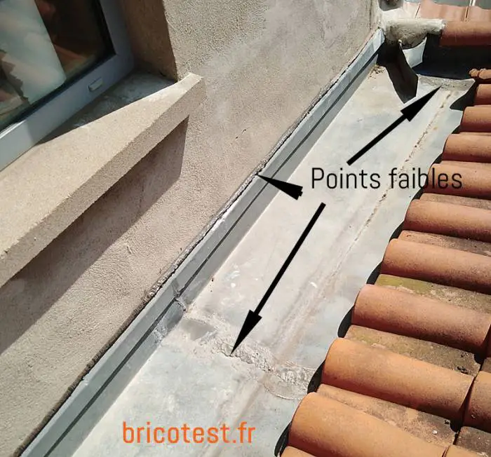 La visite du toit dans cet exemple révèle une faiblesse au niveau de la noue, jonction entre la pente du toit et le mur. Cette noue est un zinc qui permet la récolte et l’évacuation des eaux pluviales. Réalisé il y a environ 35 ans, certaines soudures présentent des fissures responsables d’infiltrations.