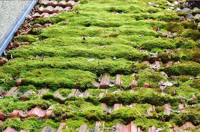 Phase 2 : Désagrégation : Les mousses mortes se détachent progressivement de la surface du toit sous l’action du vent et de la pluie.