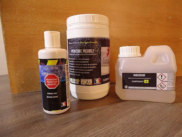 -Le Dégraissant Promoteur Universel Pro permet un dégraissage des supports fermés (carrelages, faïences, verre, métaux…) il optimise l’adhérence des résines ou peintures. - Préparer la peinture meuble bi-composants, Arcane industrie, à raison de 1 volume de durcisseur pour 3 volumes de peinture.