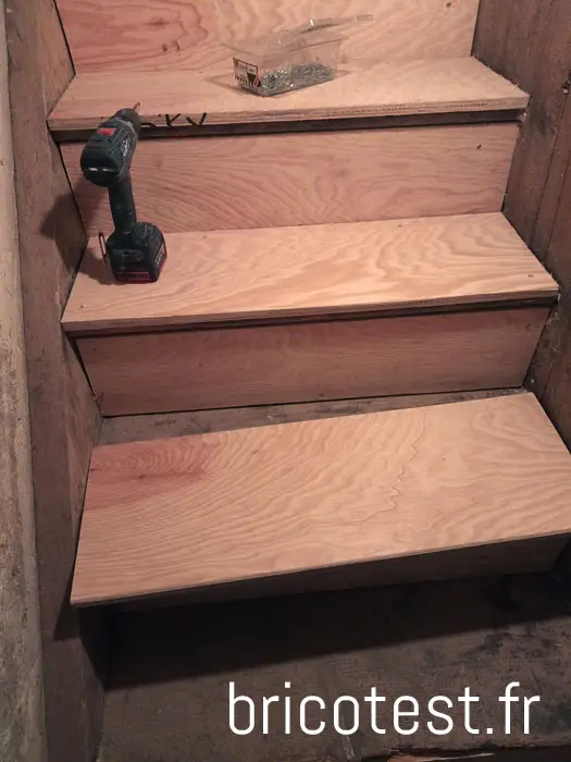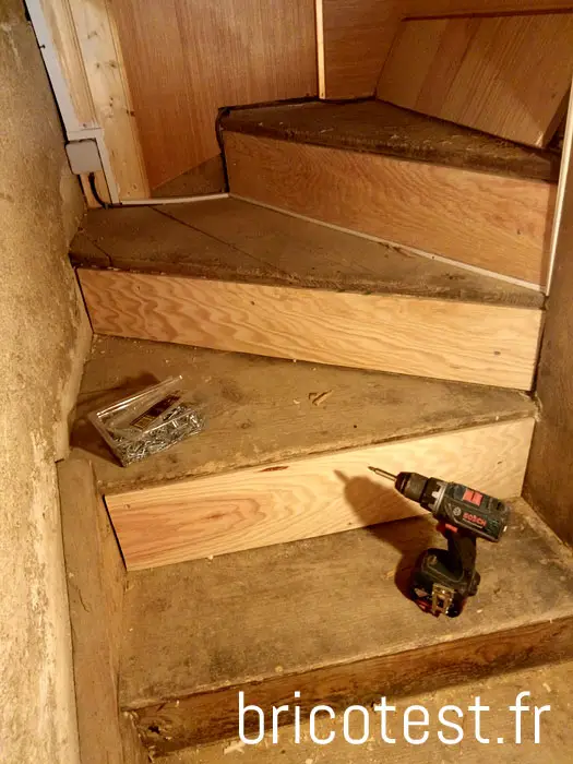On commence par les contremarches, ce qui permettra d’avoir la bonne mesure pour les marches (giron). A savoir longueur du giron actuel plus épaisseur de la contremarche ajoutée.