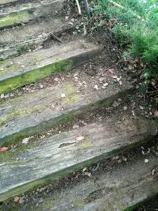 Apparemment, l’escalier semble à peu près en bon état sur la première image. Cependant, ne vous y fiez pas car le bois à l’intérieur des marches est complètement pourri ; de plus, les marches penchent à droite et s’affaissent sur l’avant. La propriétaire a failli passer à travers une des marches !