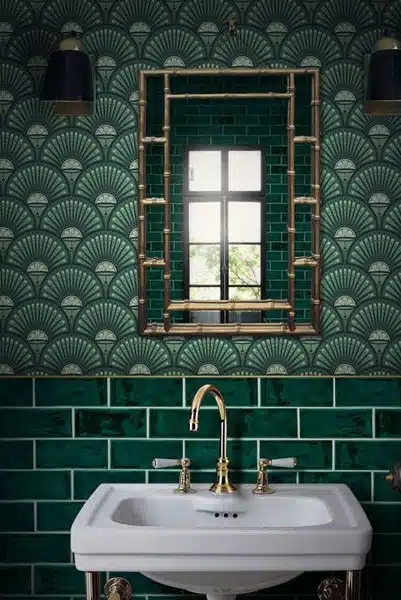 Autres ornements emblématiques du mouvement Art Déco pour sublimer une salle-de-bain : les cercles et octogones, les lignes verticales, les triangles…