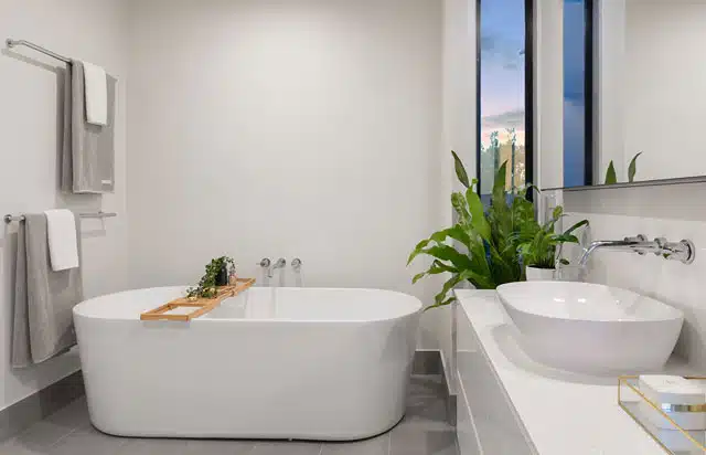 Quel que soit le coloris dominant de votre salle de bain monochrome, restez dans l’esprit scandinave : pas de mobilier aux lignes et couleurs extravagantes esprit maximaliste ! Misez au contraire sur des courbes épurées, des teintes moelleuses, des ambiances conciliantes… En gardant en tête : ‘the less is more‘ !