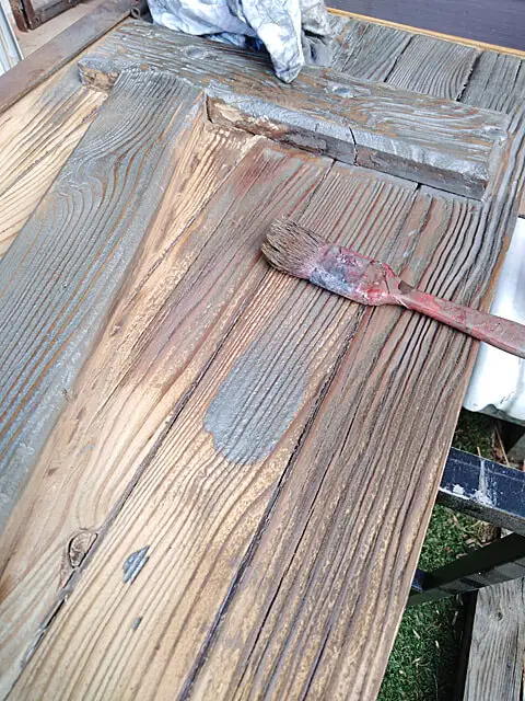 Le produit se présente sous forme d’un liquide huileux teinté en l’occurrence en gris. Le premier essai n’était pas bon au niveau de la teinte, car pour du vieux bois la concentration de base était trop forte en pigment (nous n’avions pas précisé lors de la commande le support prévu !)